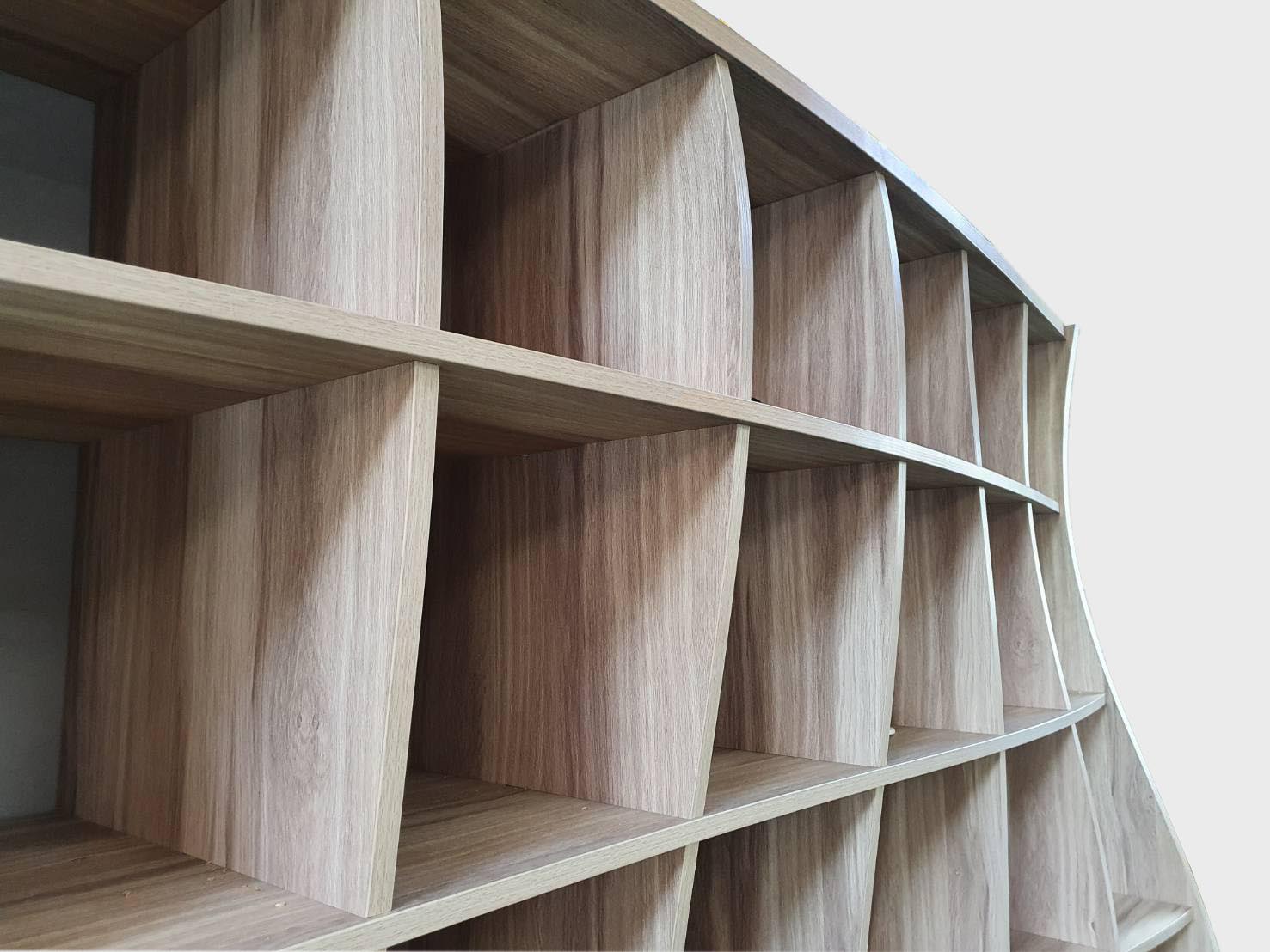 無限心悅預製家具利用數位化製程與自動化設備,可以大量生產客製化的曲線/弧型系統板與曲線封邊,也因為非師傅手工方式裁切、封邊、修邊,故可以做到高精準性以及量產成品一致性,減少人工失誤! 亦做到兩片曲線系統板可以完全密合無空隙的高精準度! 因此無限心悅預製家具才能在系統櫃交接處採用 45゚接角密合交接,比起 90゚接角更為美觀! 當然還有最重要的導角也是必備的!