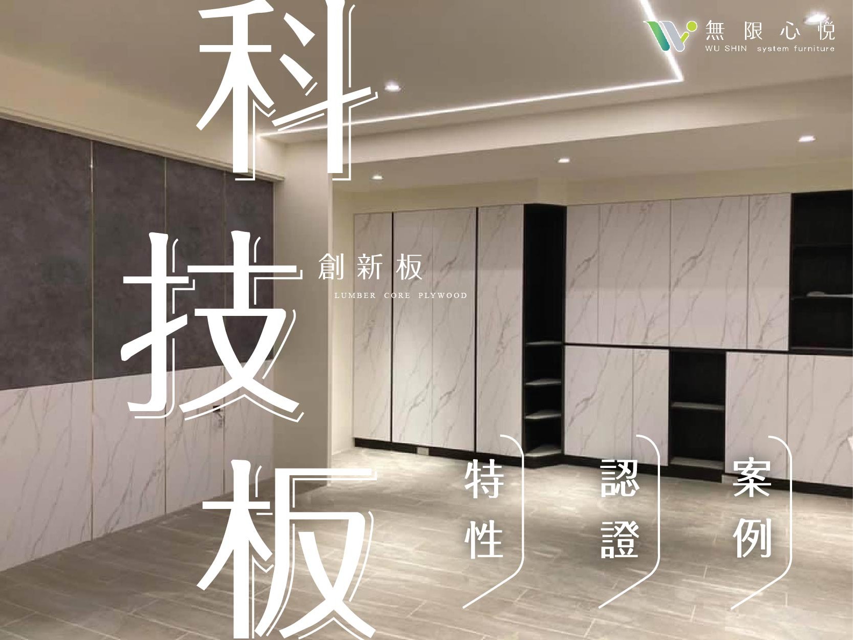 科技板(創新板)是什麼? 科技板也叫做創新板,科技板(創新板)基材為木心板,表面為美耐皿。基材為木心板,密度高、結構支撐強度大。材重量輕,比塑合板輕約35%,可以做組件輕量化,遇到吊櫃、層板安全性增加,師傅好安裝,施工快速,減少工時。亦可使用系統櫃硬體設備做加工,科技板(創新板)木芯板與塑合板系統櫃做結合。例如:桶身木心板,門片塑合板。