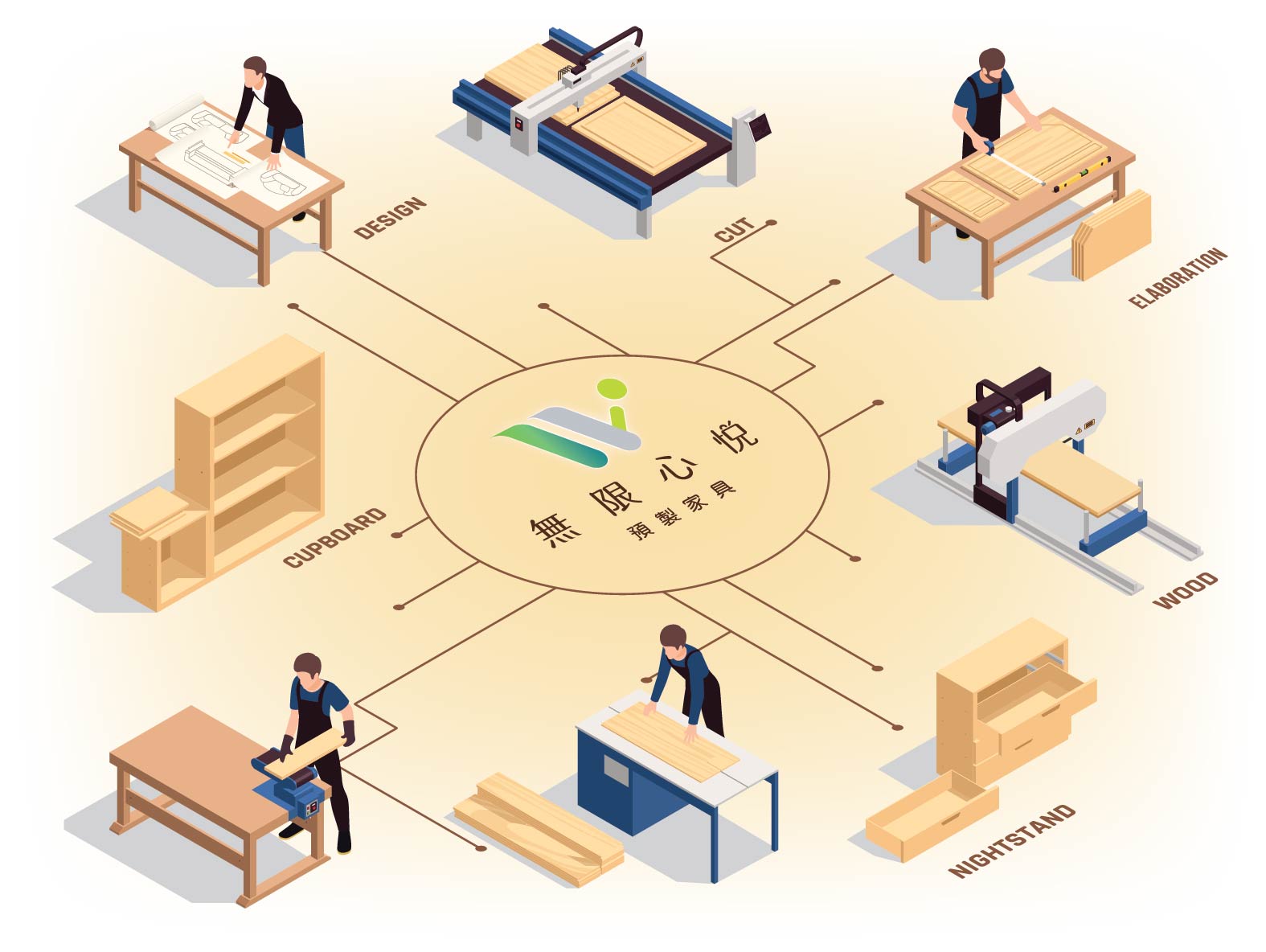 無限心悅預製家具品牌秉持著「具有體感溫度的系統家具」的中心思想,設計出以人與環境為本的系統家具,我們的初心是以人與環境為本心做為起點的系統家具品牌,思考讓人產生與環境、空間協作出更好、更舒適的使用體驗,更以愛護這片土地循環再生的概念出發,營造更好的生活環境與空間。